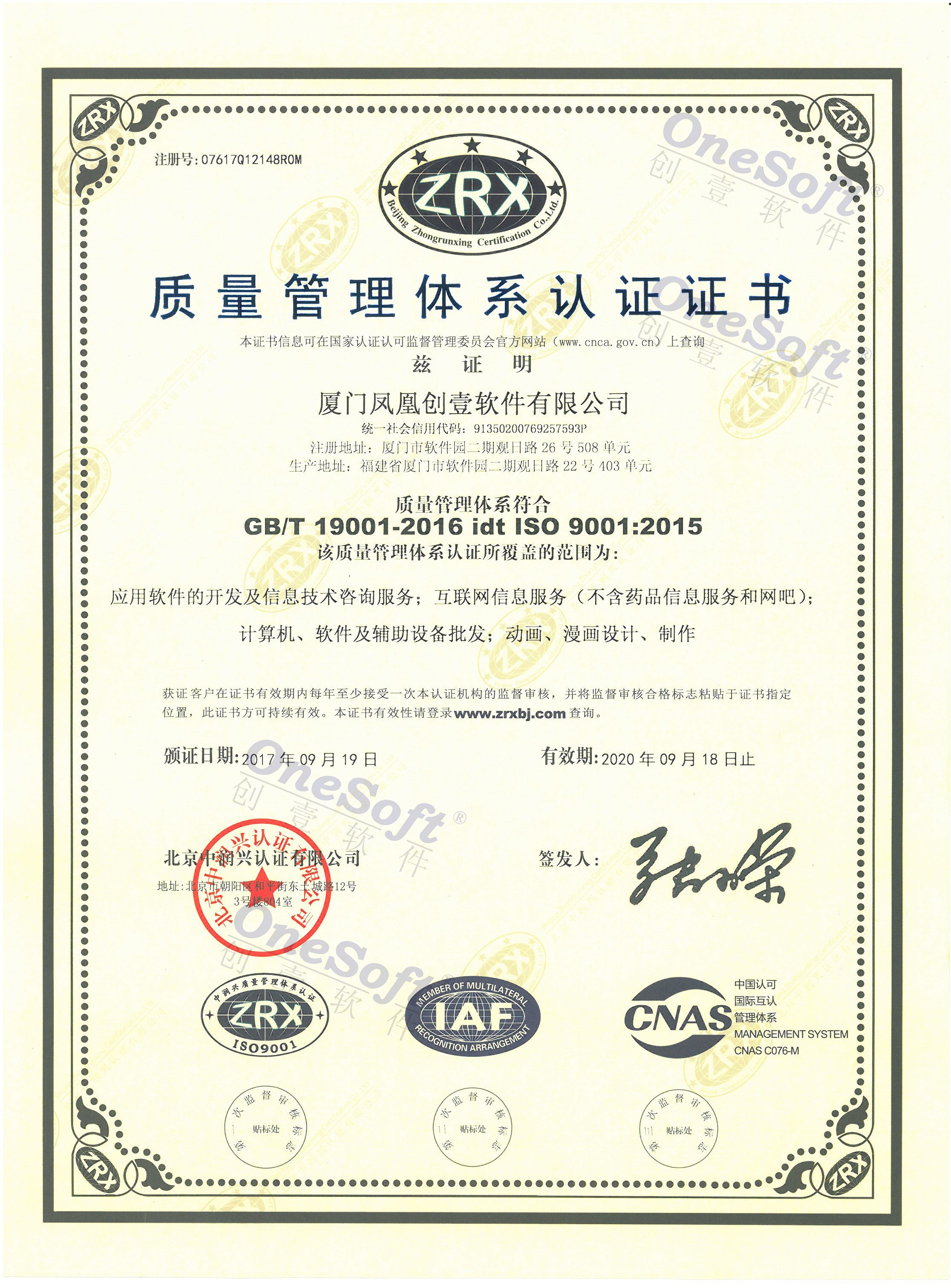 2017年質量管理體系認證證書