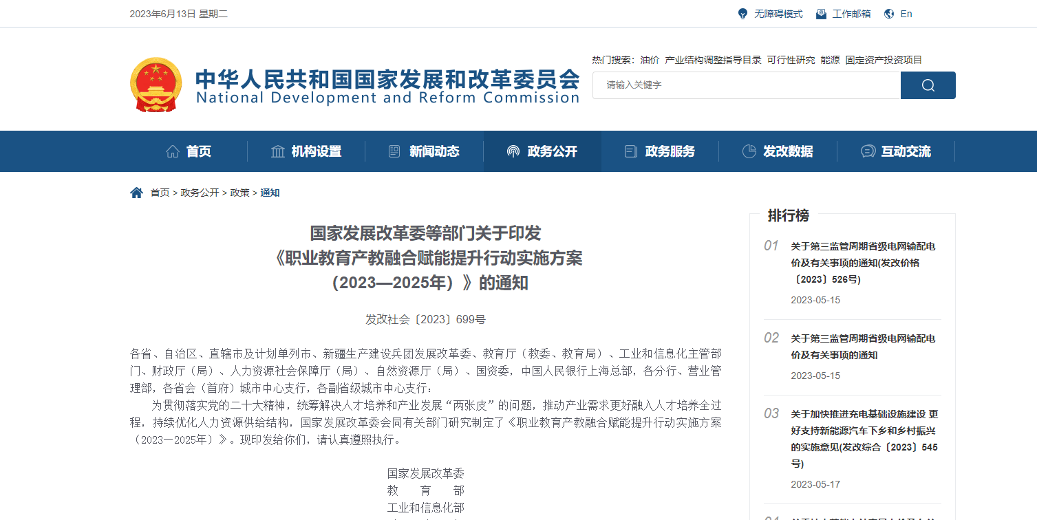 國(guó)家發(fā)展改革委等部門印發(fā) 《職業(yè)教育產(chǎn)教融合賦能提升行動(dòng)實(shí)施方案 (2023—2025年)》的通知