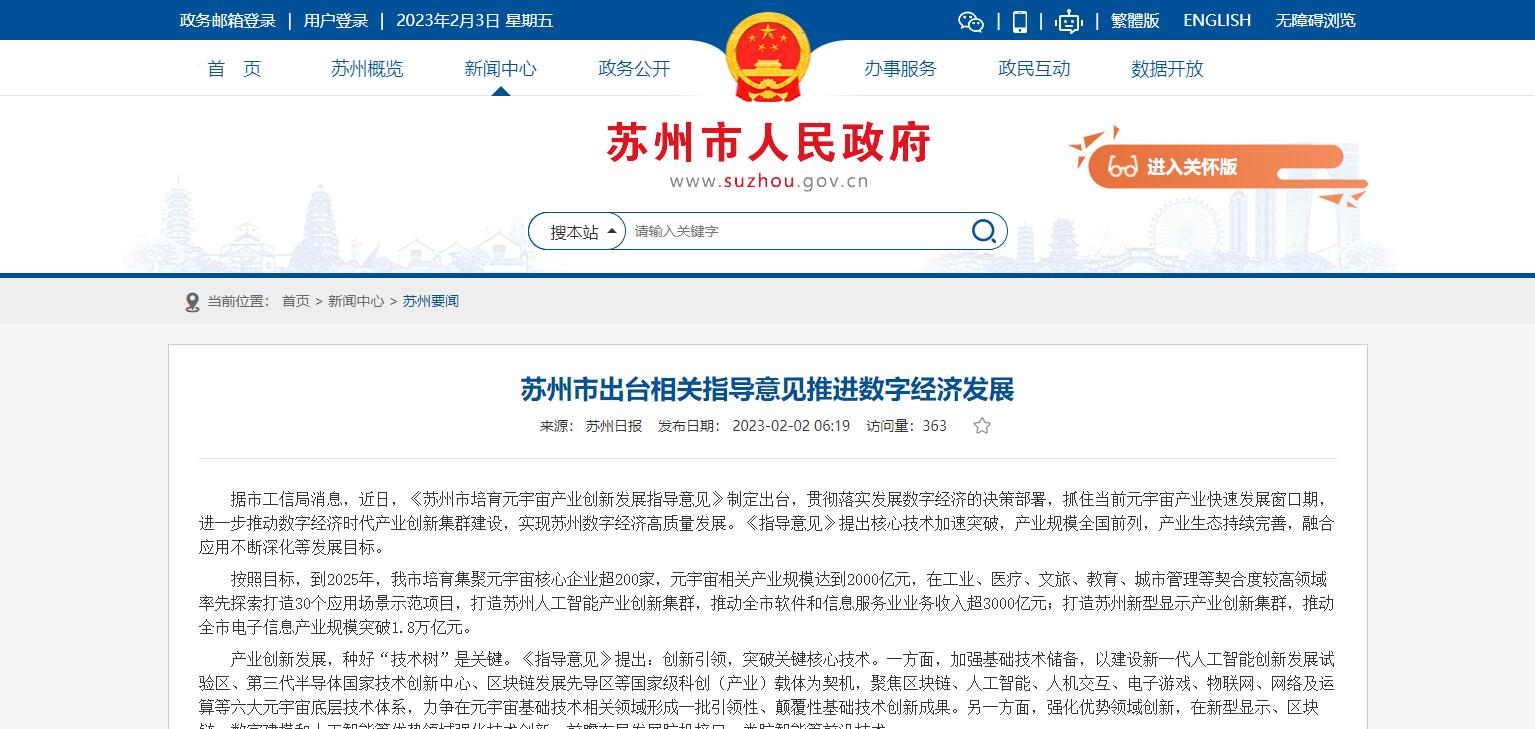 蘇州發(fā)布培育元宇宙產(chǎn)業(yè)創(chuàng)新發(fā)展指導(dǎo)意見:到2025年元宇宙相關(guān)產(chǎn)業(yè)規(guī)模達到2000億元