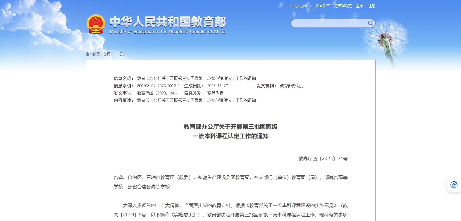 教育部辦公廳關(guān)于開展第三批國家級 一流本科課程認(rèn)定工作的通知