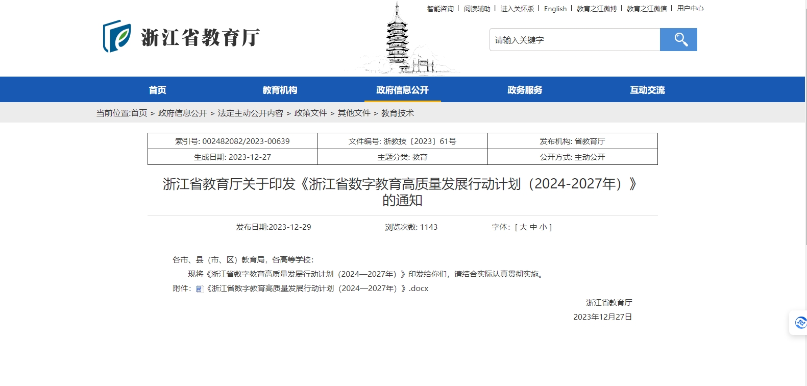 浙江省教育廳關(guān)于印發(fā)《浙江省數(shù)字教育高質(zhì)量發(fā)展行動計(jì)劃(2024-2027年)》的通知