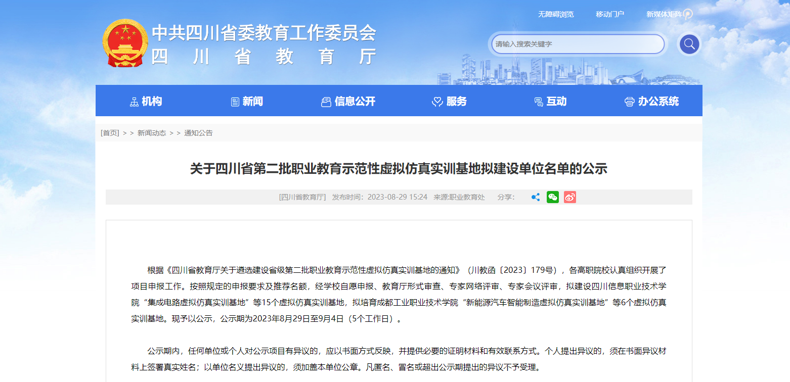 近日,四川省教育廳根據(jù)《四川省教育廳關(guān)于遴選建設(shè)省級(jí)第二批職業(yè)教育示范性虛擬仿真實(shí)訓(xùn)基地的通知》(川教函〔2023〕179號(hào)),公布了第二批職業(yè)教育示范性虛擬仿真實(shí)訓(xùn)基地?cái)M建設(shè)單位名單,擬建設(shè)四川信息......