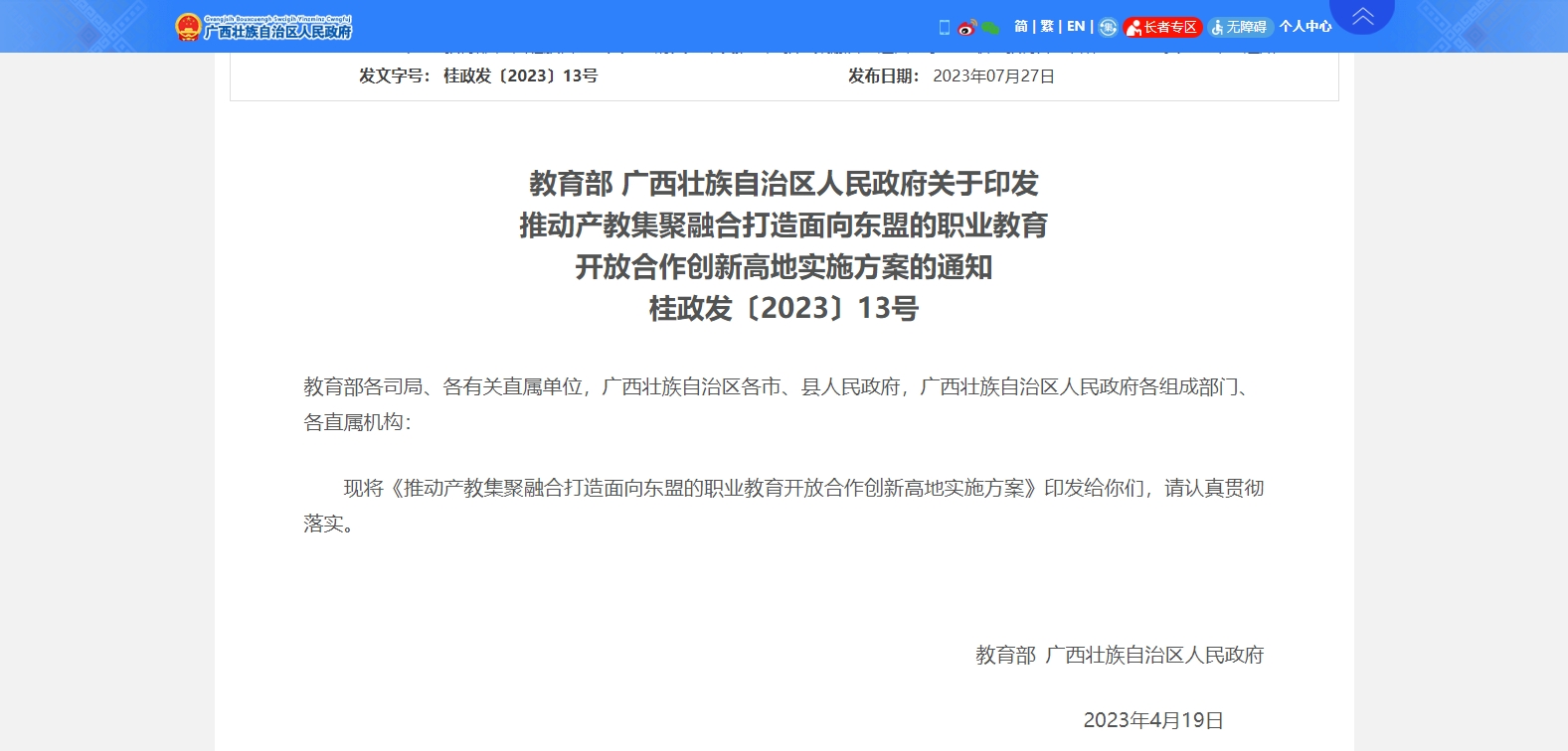 教育部、廣西壯族自治區(qū)人民政府聯(lián)合印發(fā)了《推動(dòng)產(chǎn)教集聚融合打造面向東盟的職業(yè)教育開放合作創(chuàng)新高地實(shí)施方案》