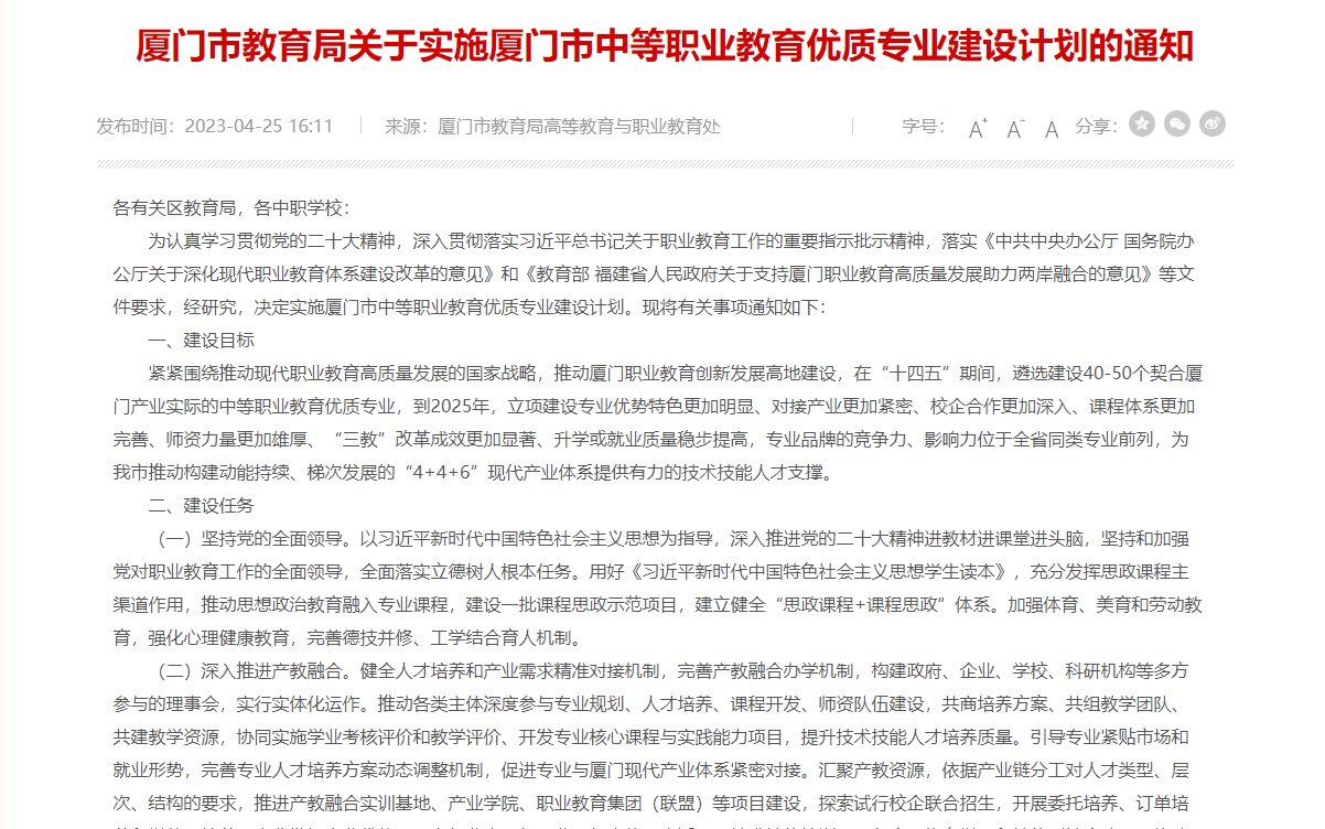 近日,廈門市教育局發(fā)布關(guān)于實施廈門市中等職業(yè)教育優(yōu)質(zhì)專業(yè)建設(shè)計劃的通知,緊緊圍繞推動現(xiàn)代職業(yè)教育高質(zhì)量發(fā)展的國家戰(zhàn)略,推動廈門職業(yè)教育創(chuàng)新發(fā)展高地建設(shè),在“十四五”期間,遴選建設(shè)40-50個契合廈門產(chǎn)......