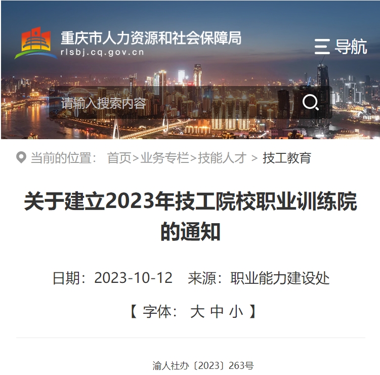 重慶市人力資源和社會保障局辦公室官方發(fā)布關(guān)于建立2023年技工院校職業(yè)訓(xùn)練院的通知,決定建立重慶工貿(mào)技師學(xué)院、重慶能源工業(yè)技師學(xué)院、重慶交通技師學(xué)院等3個技工院校職業(yè)訓(xùn)練院,項目建設(shè)周期為2年,按規(guī)定......