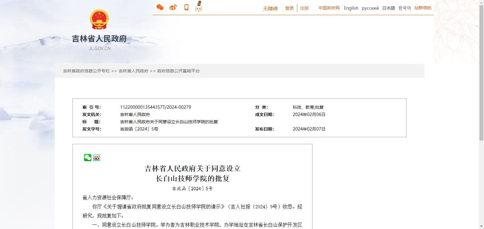 吉林省人民政府關于同意設立長白山技師學院的批復 吉政函〔2024〕5號 省人力資源社會保障廳: 你廳《關于提請省政府批復同意設立長白山技師學院的請示》......